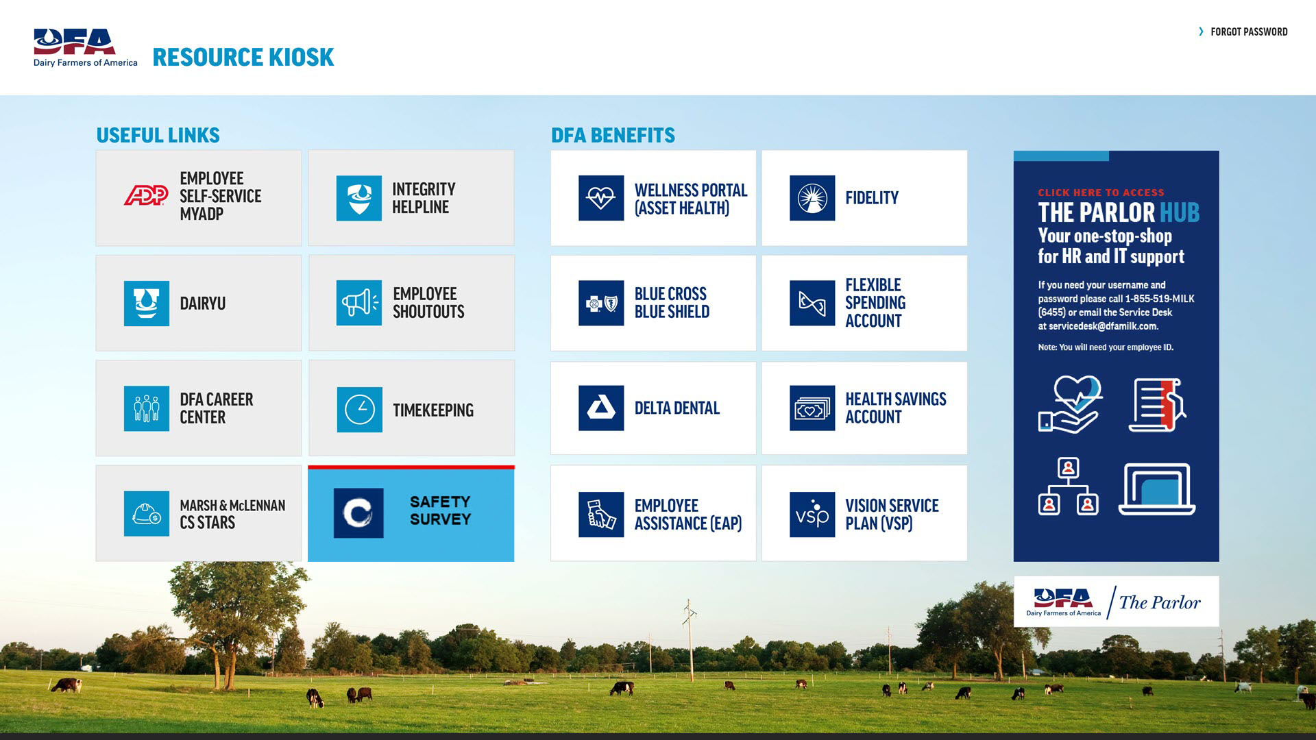 ADP Employee Self Service Diary U DFA Career Center March @Melennan CSA Stars Integrity HelpLine EmployeeShoutouts Timekeeping Wellness Portal Blue Cross Blue Shield Delta Dental EAP Fidelity Flexible Spending Health Savings Account Vision TheParlorHub Forgot Password The Parlor Safety Survey